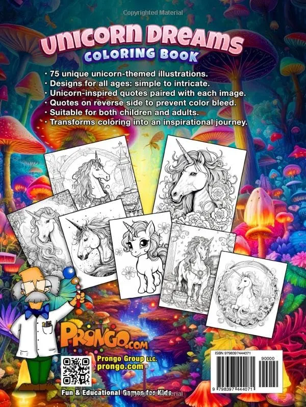 Embark on a magical journey of color and creativity with Prongo.com’s Unicorn Coloring Book. Bursting with 75 vibrant unicorn-themed illustrations ranging from delightfully simple to beautifully complex, this book offers an engaging pastime for both children and adults alike. Each illustration is paired with a whimsical unicorn-inspired quote, making it more than just a coloring book—it’s a source of inspiration and fun.